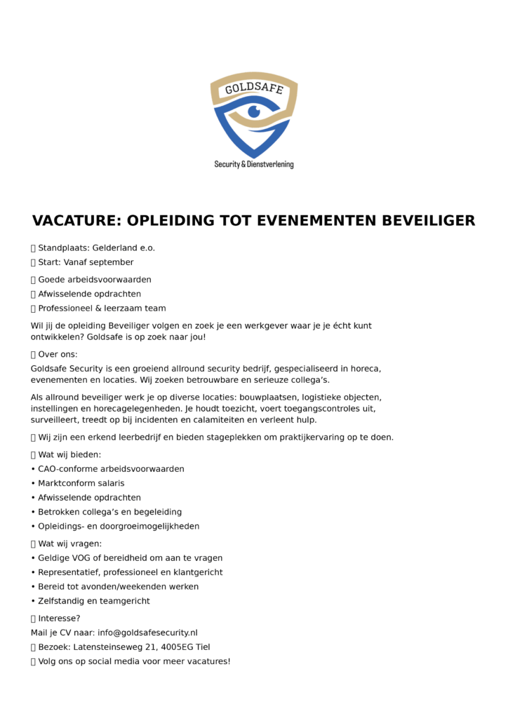 Kom werken bij Goldsafe Security! Wij zoeken: